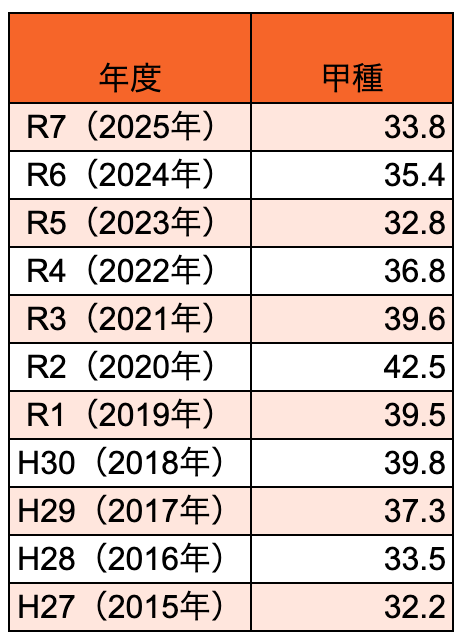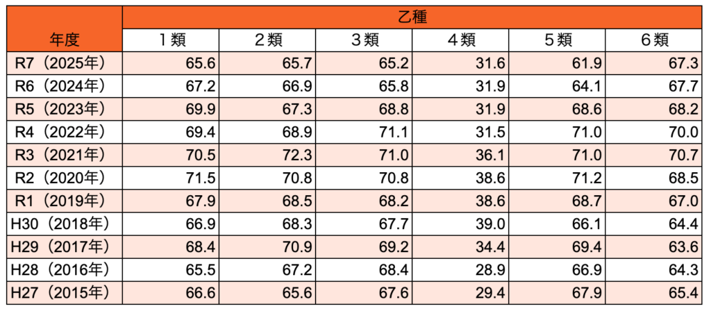 第4類は登竜門のような立ち位置のため、多くの方が受験するため、低い結果です。全体的に難易度はそれほど高くないと言えるでしょう。